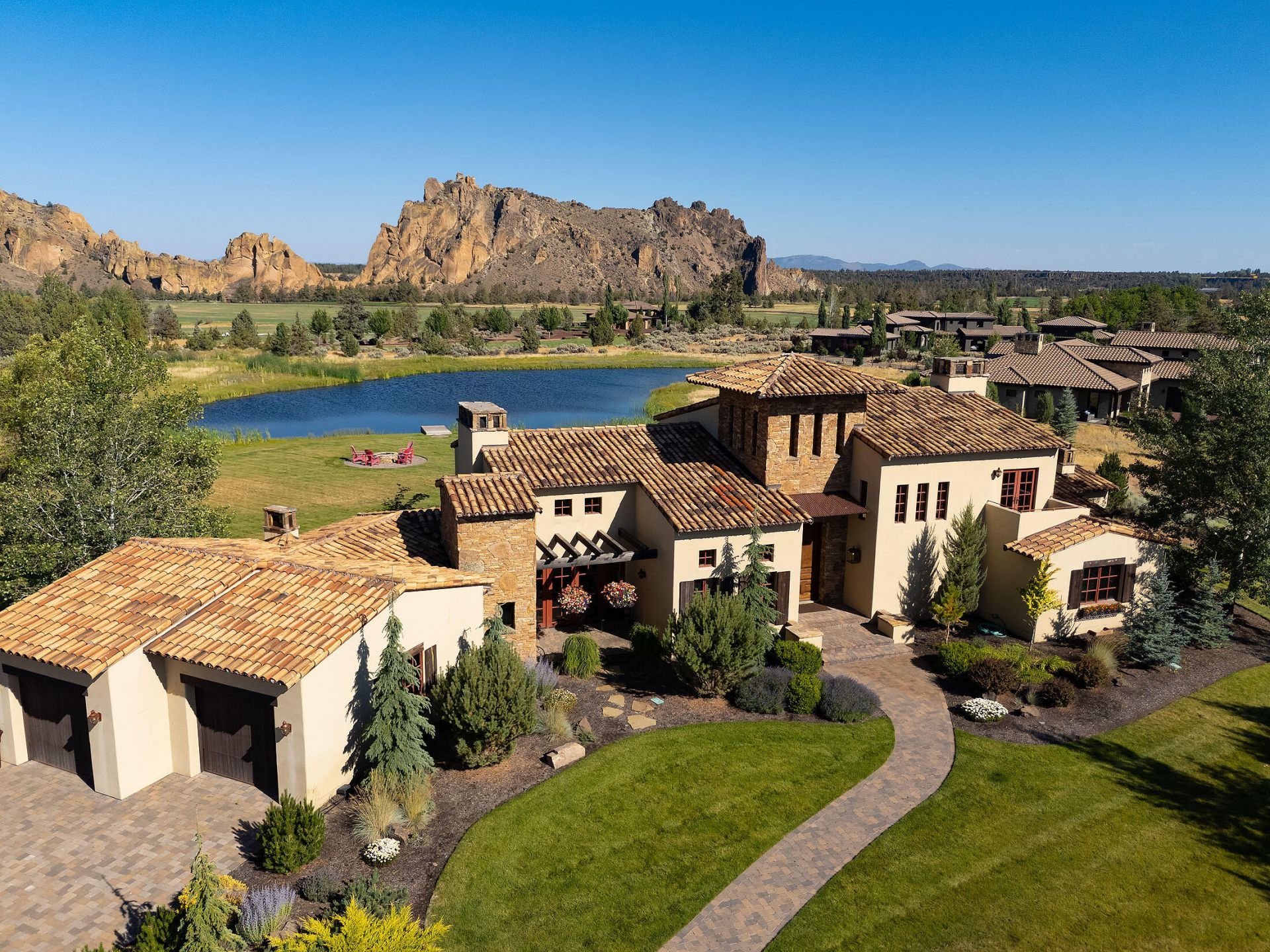 Villa De Lago, a rare lakefront estate in Ranch at the Canyons set on 3.95 acres with breathtaking Smith Rock views. Thoughtfully designed with Italian-inspired artistry throughout, this home features exposed Doug fir beams, distressed plank flooring, and striking stone tower accents. The main level primary suite offers convenience and luxury, complemented by two additional primary suites for guests or multigenerational living. An open kitchen and great room showcase towering ceilings, expansive windows, and a Viking range, creating a seamless space for entertaining. Step outside to the outdoor patio and enjoy serene water views in a setting that blends craftsmanship, privacy, and natural beauty.Located behind the gates of Ranch at the Canyons, a 1,700-acre tenants-in-common shared ranch offering privacy, open space, and a truly exceptional setting.